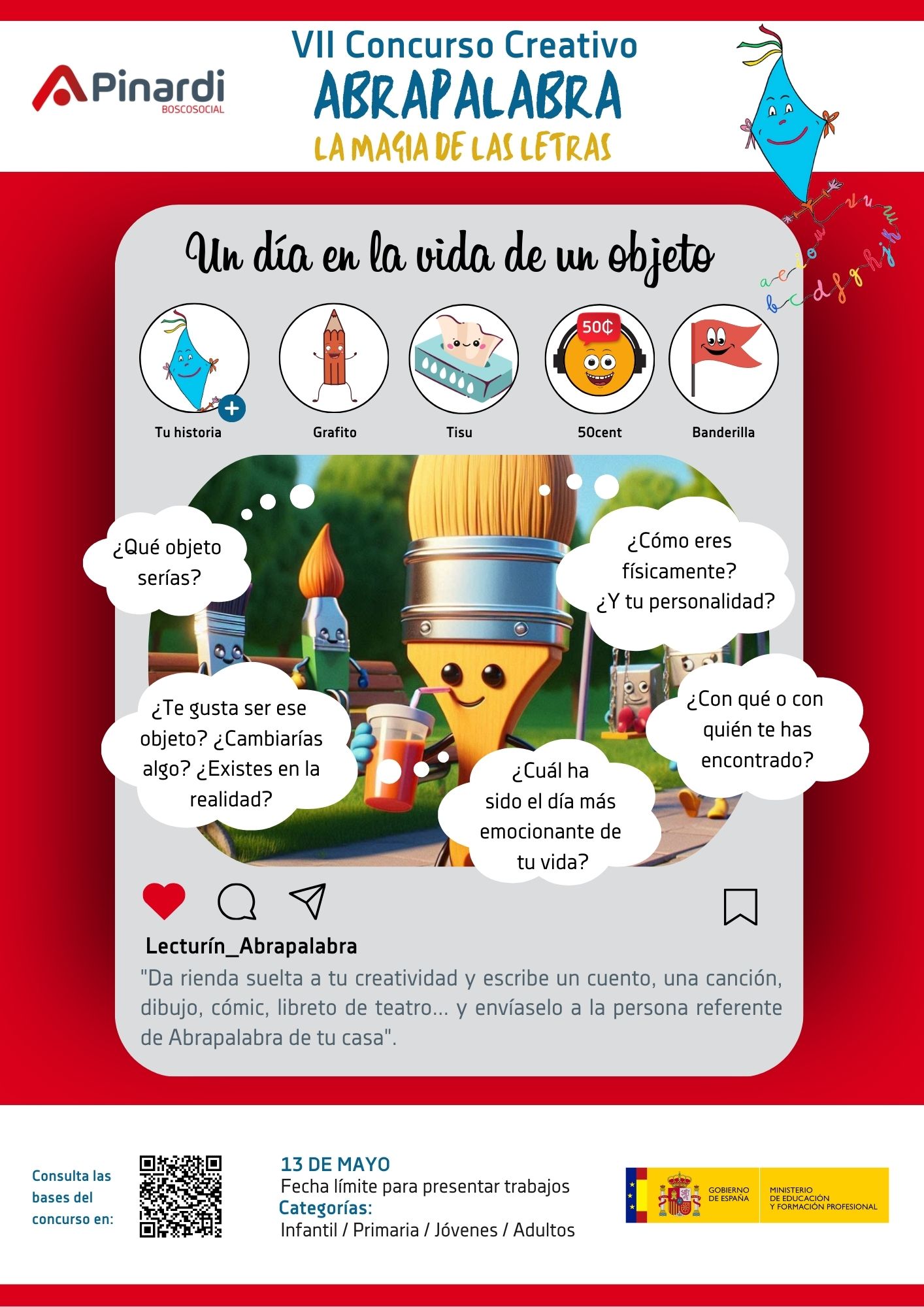 La temática central del concurso es “Un día en la vida de un objeto”. Explora la idea de convertirte en un objeto animado y vive un día emocionante y lleno de miles de aventura, deja volar tu imaginación y crea una obra de arte única, para ello dejamos las siguientes preguntas que te pueden servir como guía: